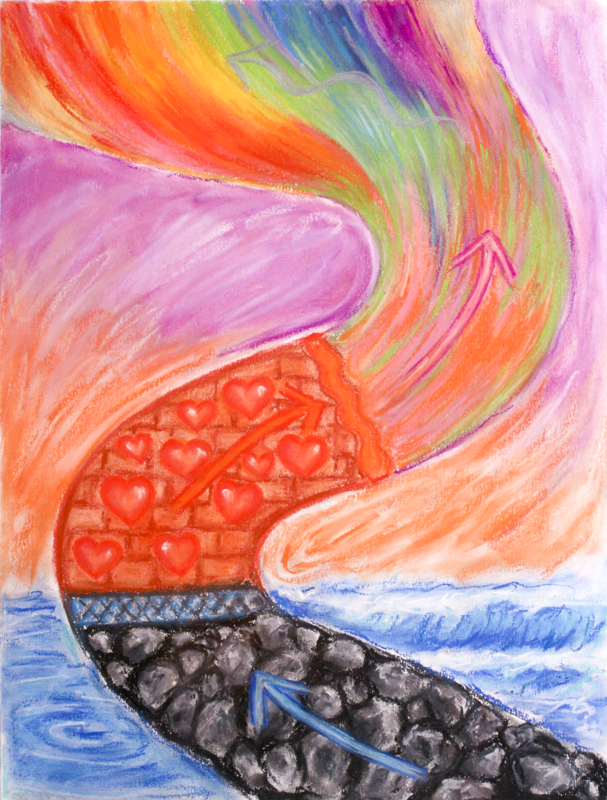 Drugi etap (tutaj reprezentowany przez mur z cegły, na którym widnieją serca w pomarańczowym kolorze) budujemy, świadomie wybierając najwyższej jakości myśli i uczucia. Uczymy się zarządzać poziomem mentalnym i emocjonalnym. Nie odczuwamy jeszcze Miłości, ale działamy z odczucia siebie na tu i teraz.